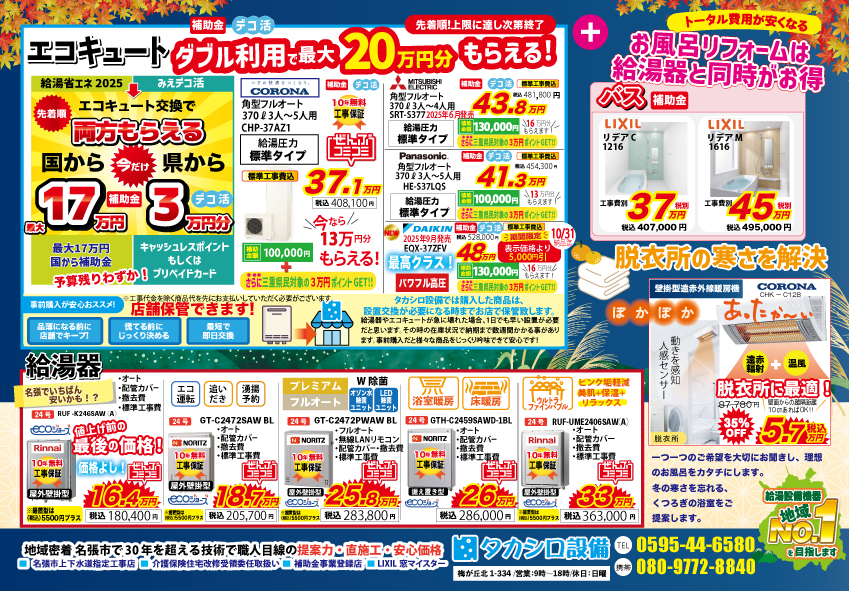 名張市でリフォーム、エコキュート、給湯設備はタカシロ設備へお気軽にご相談ください。