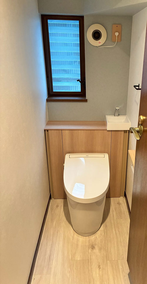 壁紙とクッションフロアを貼り替え、タンク部分と配管ははキャビネットに納めました