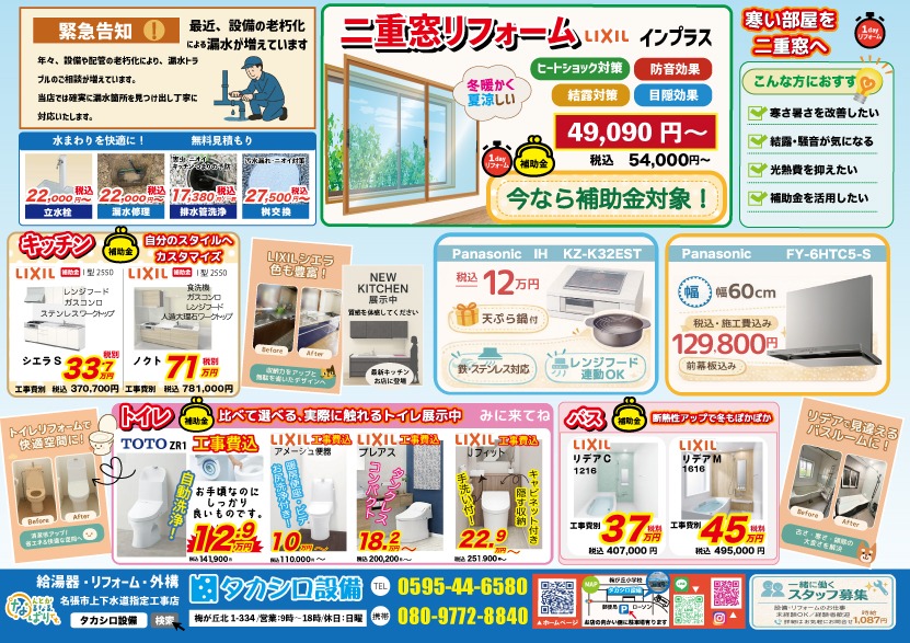 2月の最新チラシです。 期間限定!2月28日迄のご成約のお客様には、 エコキュート交換工事で下取り対応をさせていただいております! IHクッキングヒーター Panasonic KZ-K32ESTへの交換工事では天ぷら鍋のプレゼント! その他お得な情報盛り沢山です♪ぜひご覧ください。 チラシ掲載以外のメーカーも取り扱っております。お気軽に見積もりをご依頼ください。もちろん見積もりは無料です。